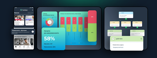- Прозрачный контроль и аналитика: статус прохождения, результаты тестов, отчёты для руководителей, выявление «узких мест» программ.